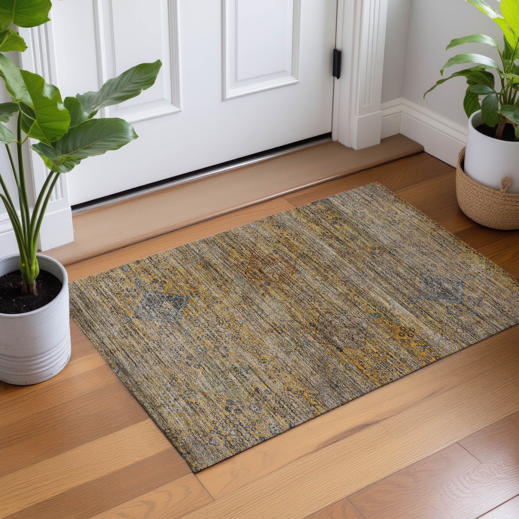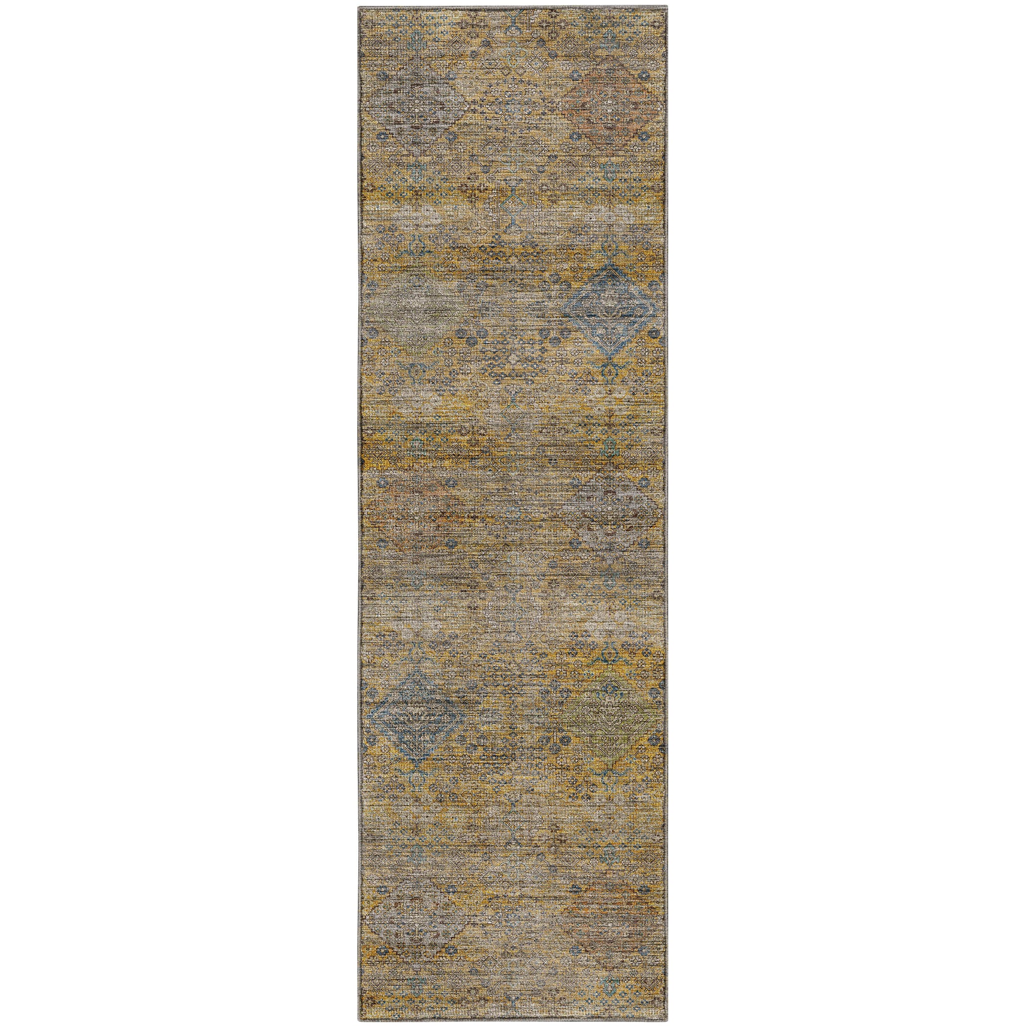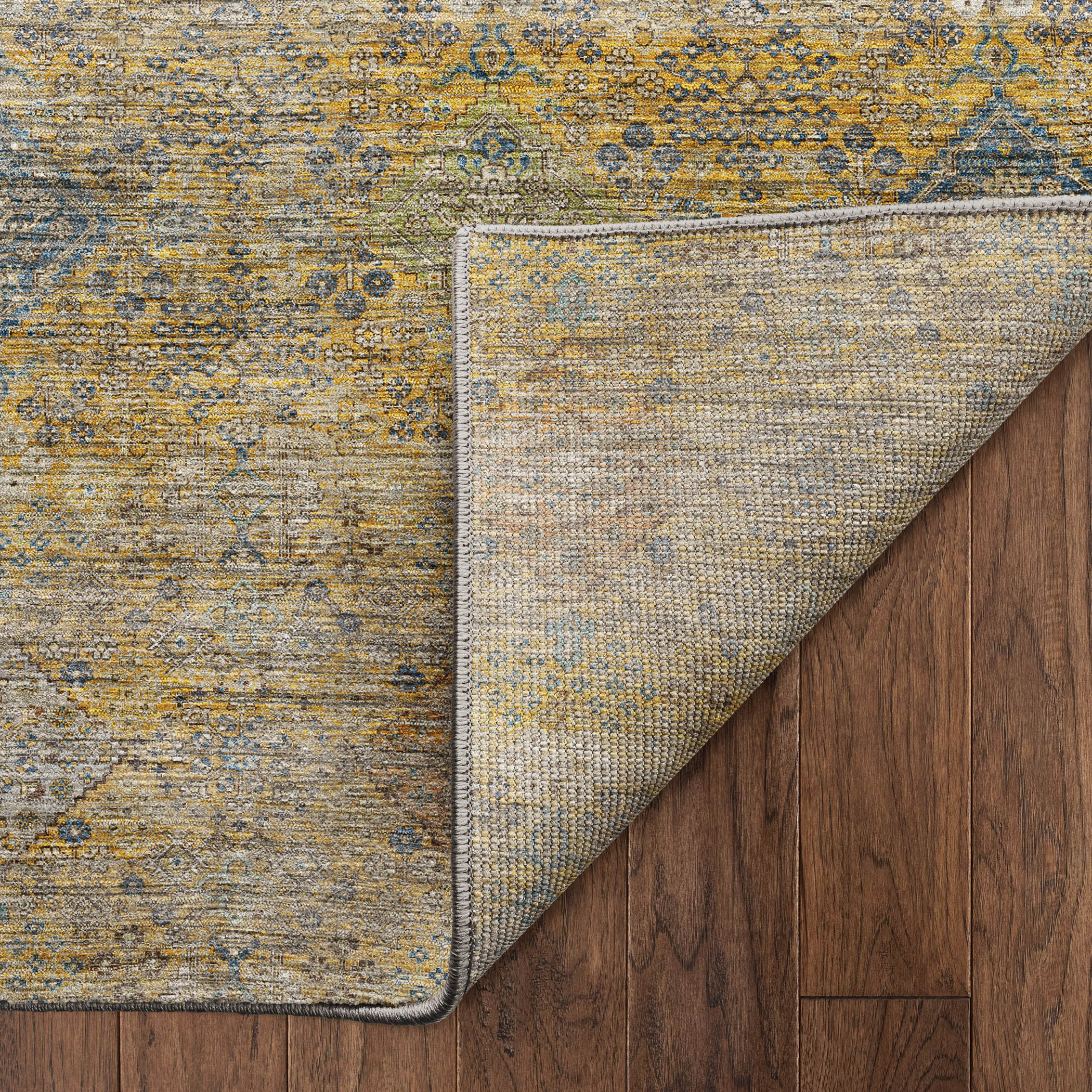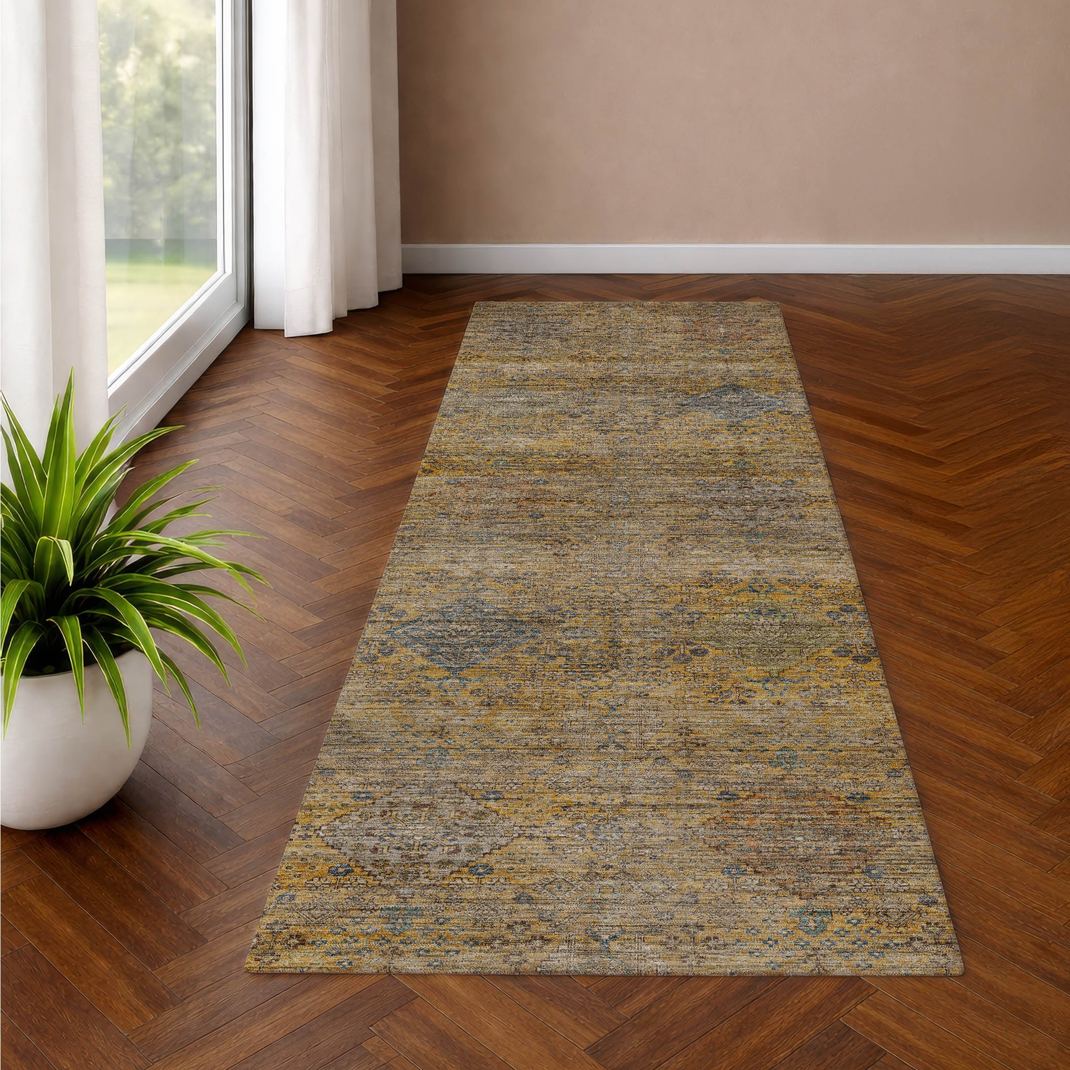 Colors in Rug: Gold, Copper, Ivory, Blue, Paprika
