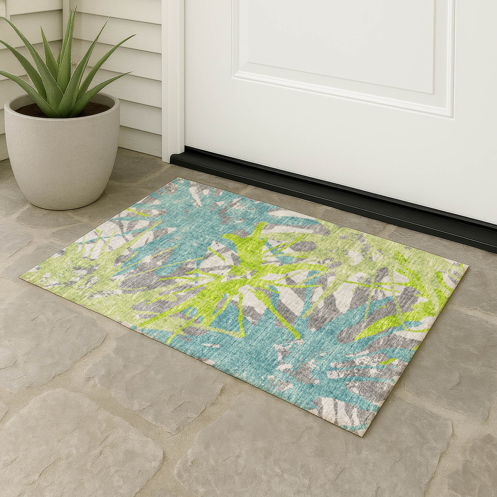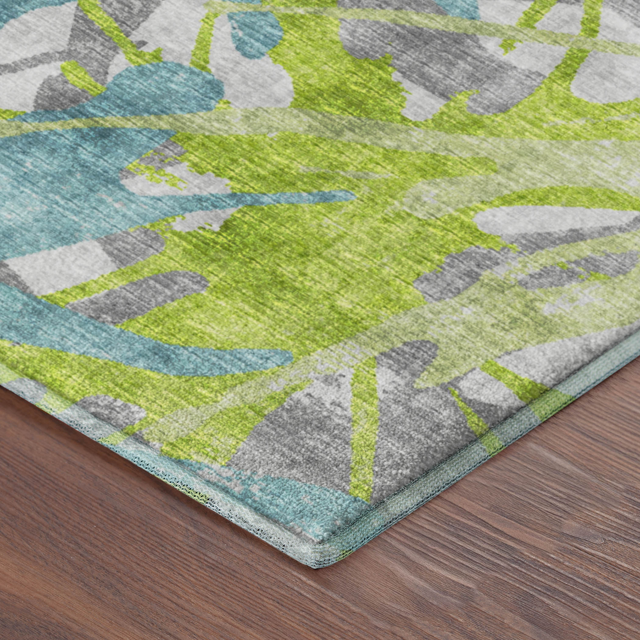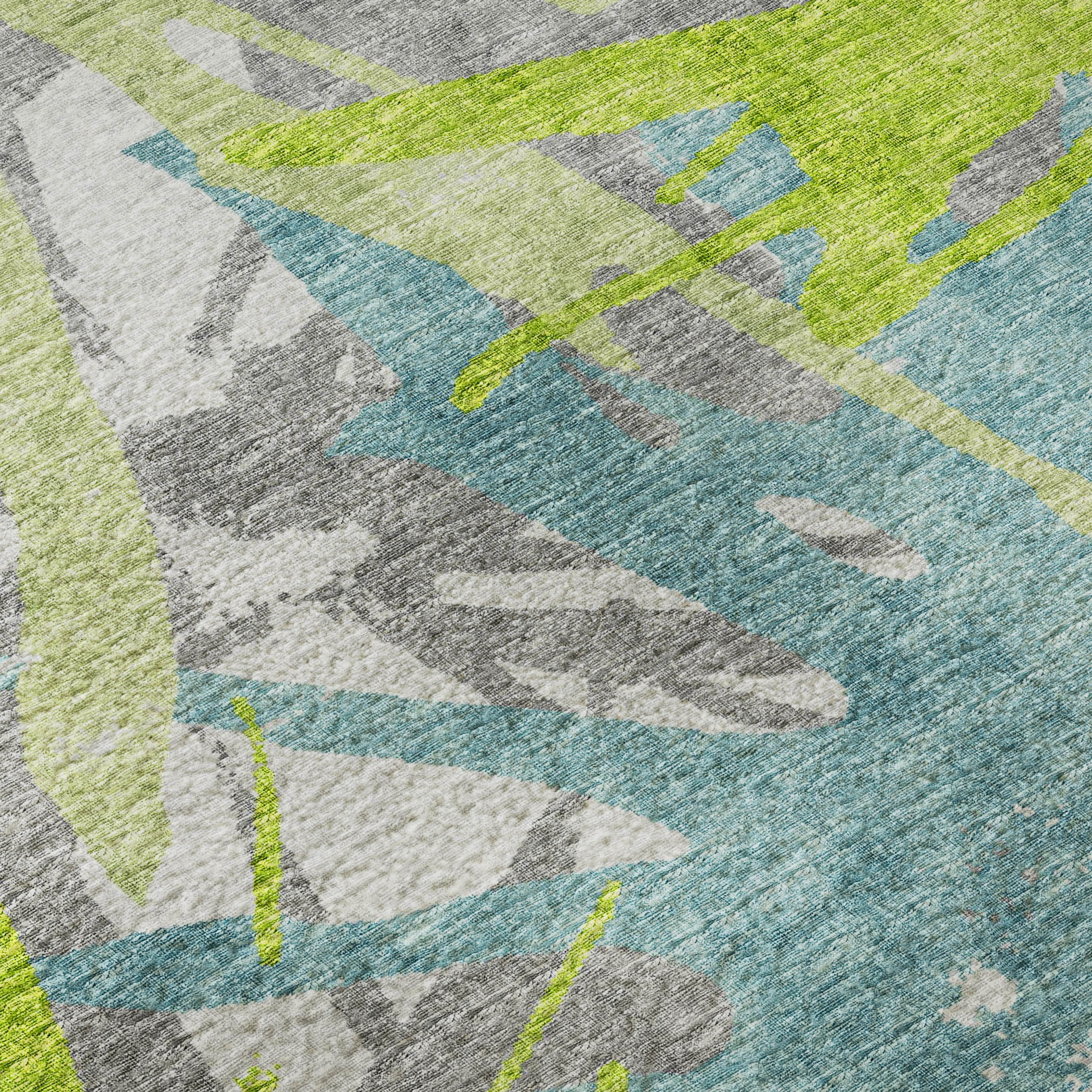 Colors in Rug: Lime, Teal, Charcoal, Gray