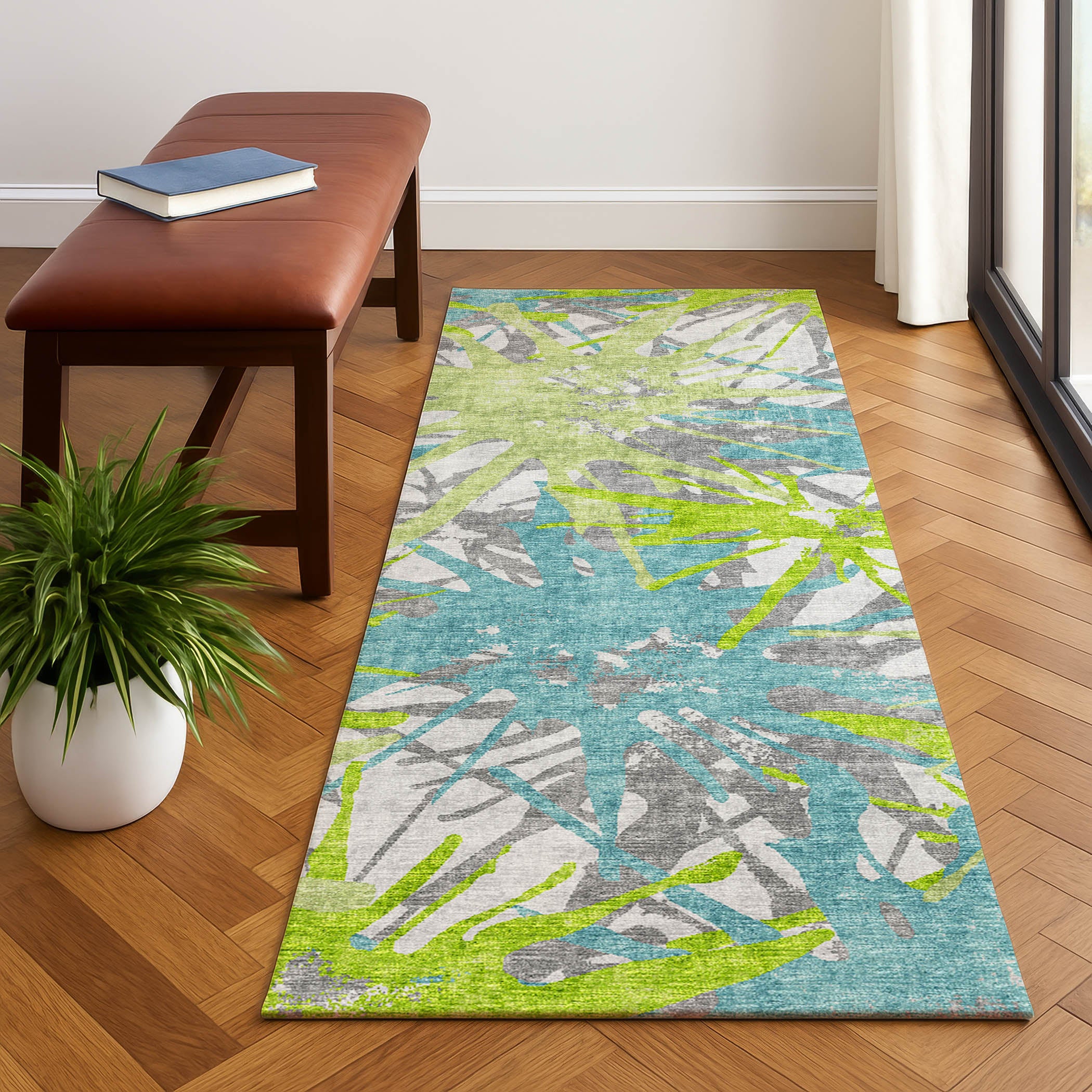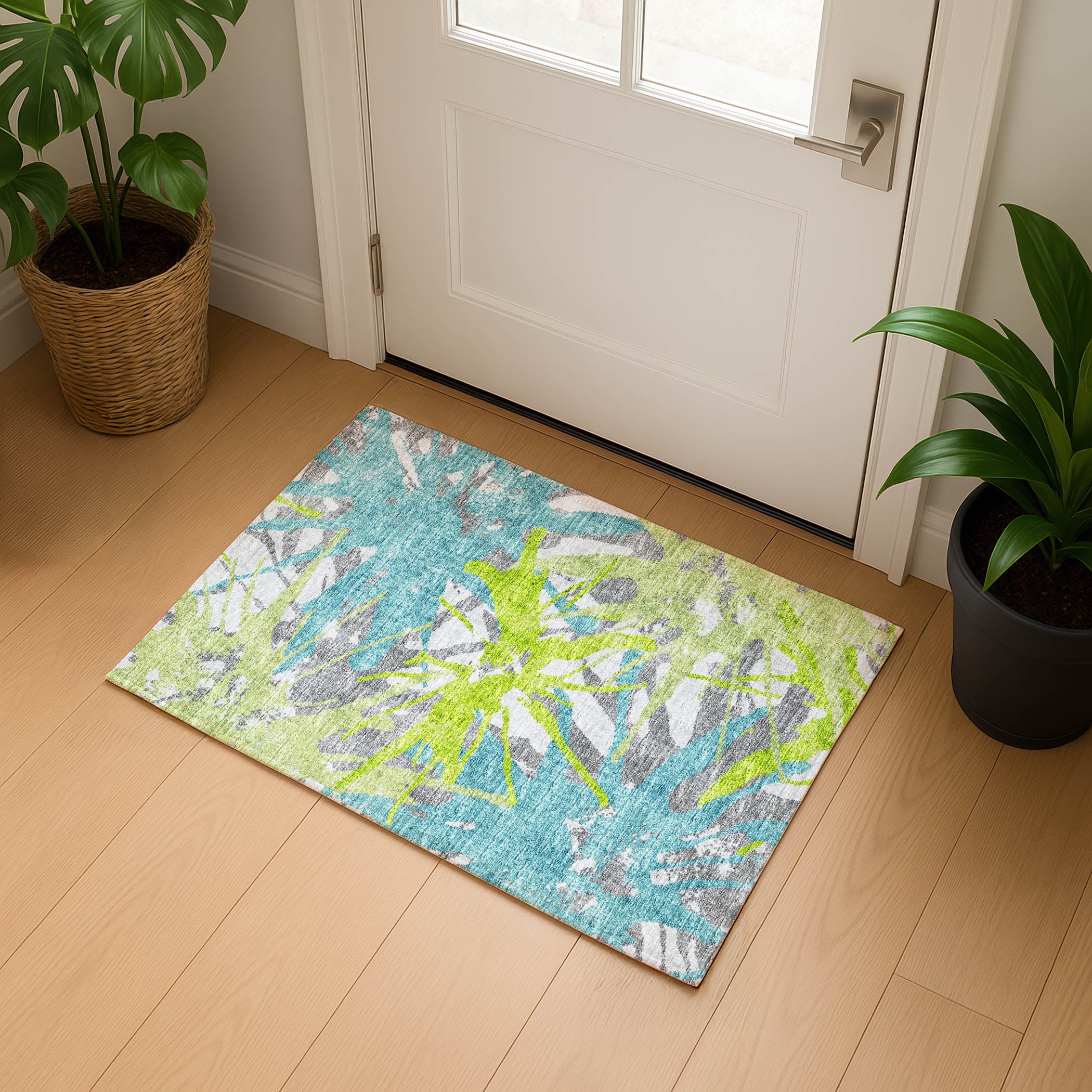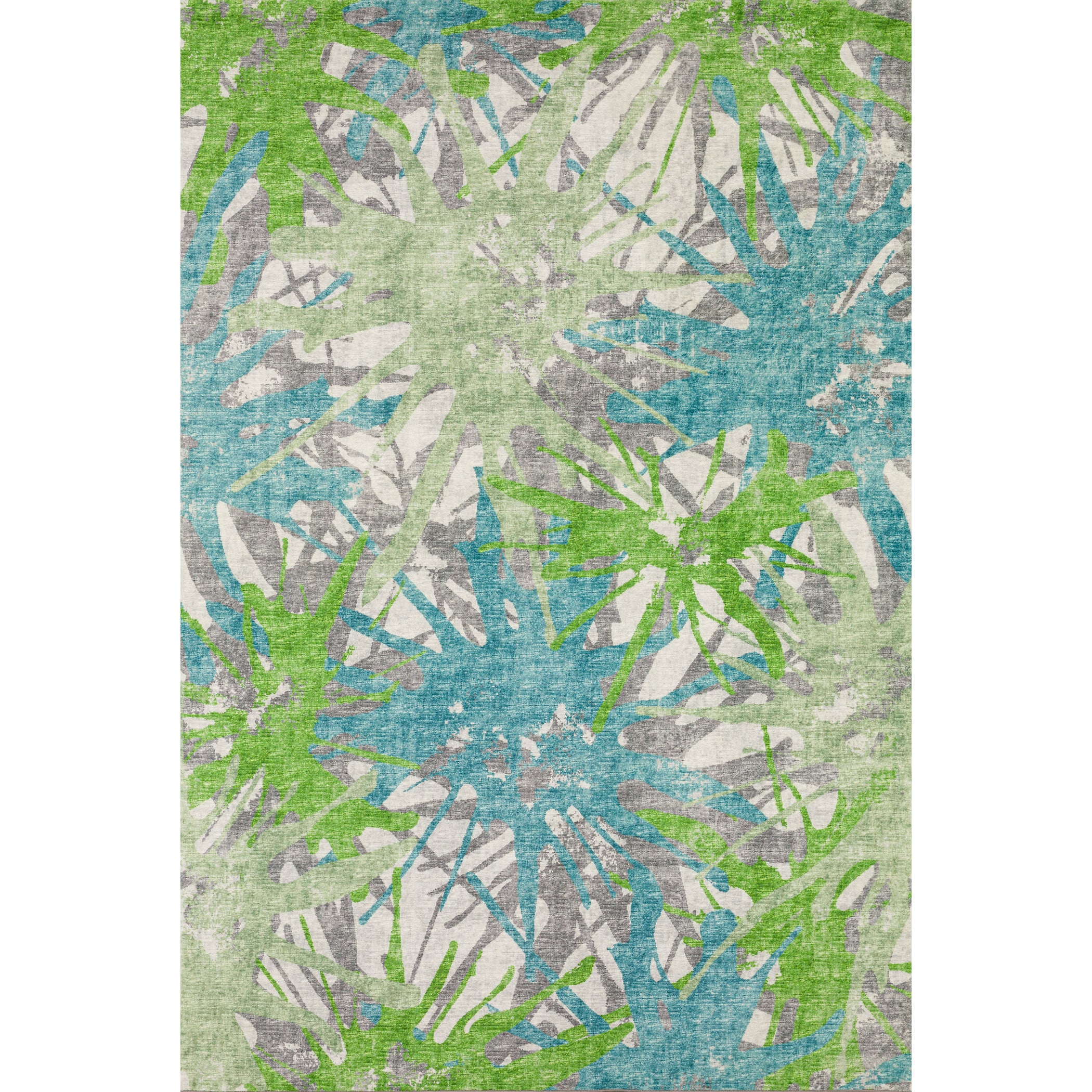 Colors in Rug: Lime, Teal, Charcoal, Gray