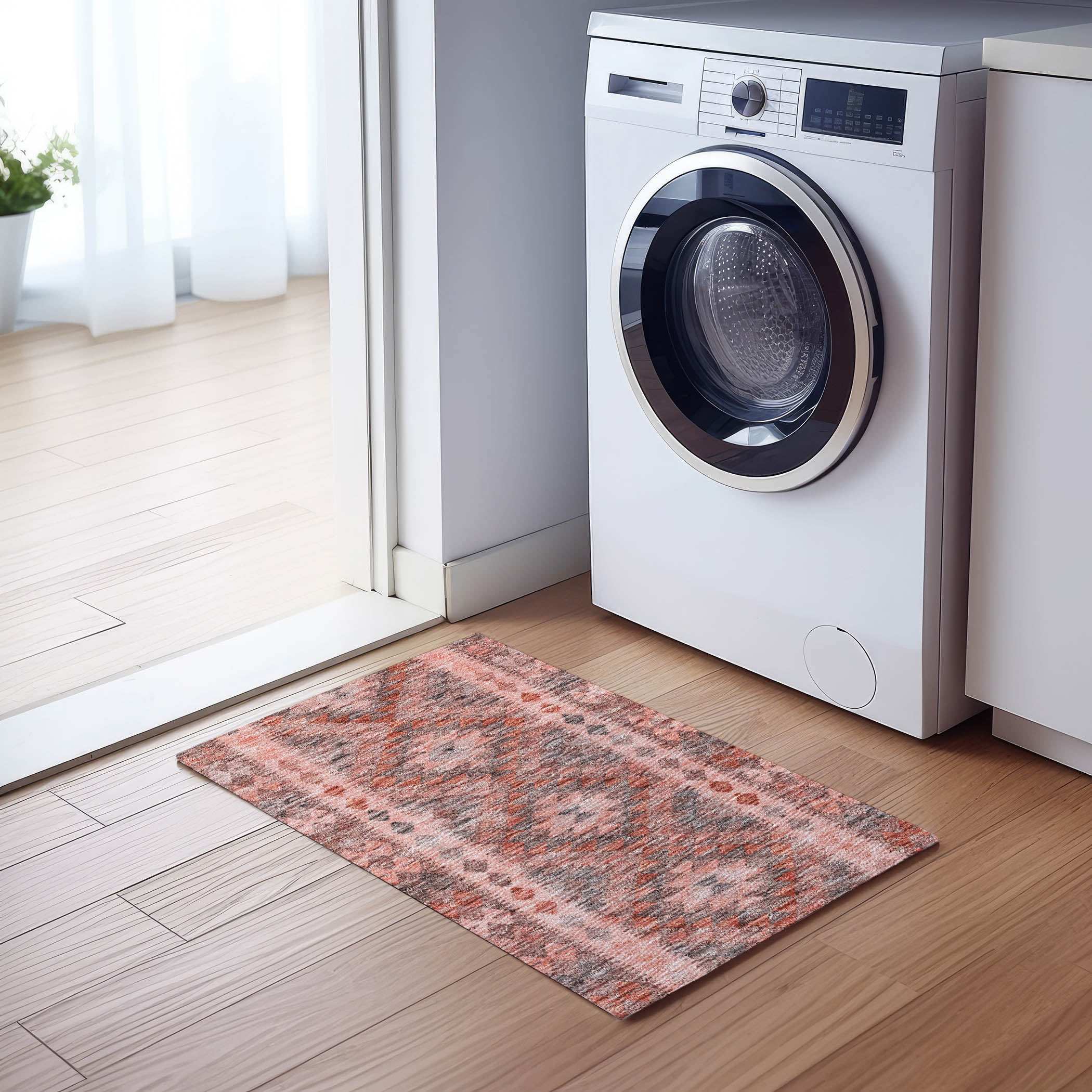 Easy care. Machine Washable. Larger rug sizes may not fit into a residential washing machine. They may be washed in a commercial size washing machine or hosed-off outside with mild soap and water. Air-dry, do not machine dry. Vacuum (without a beater bar), shake out or sweep regularly.